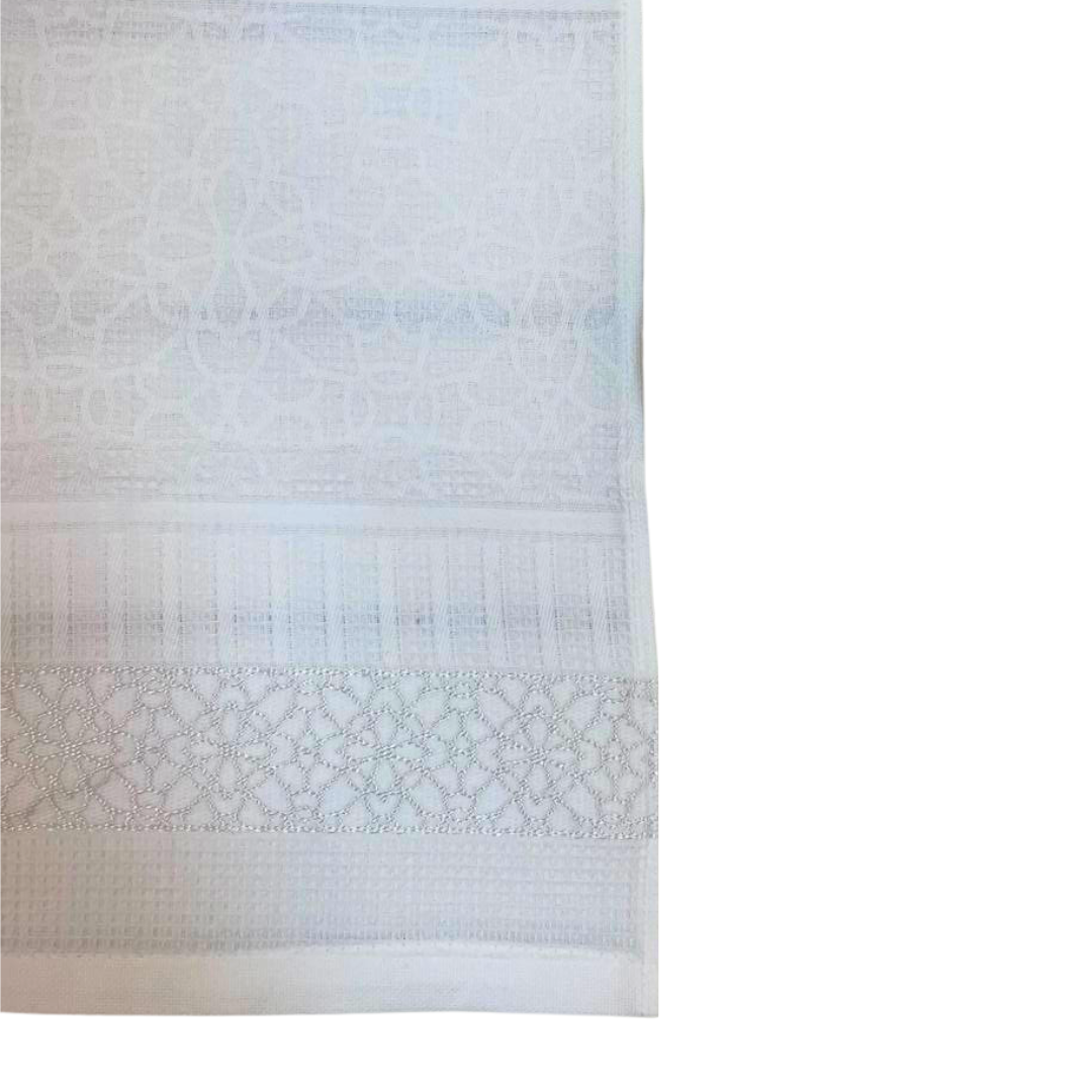 Красивое вафельное полотенце 50х70 с необычной структурой и серебряным полиэфиром в бордюре. Прекрасно дополнит сервировку стола в качестве салфетки.